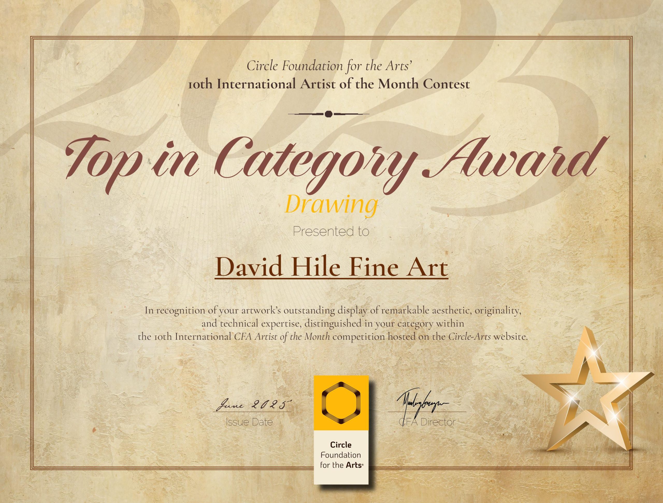 I entered their competition “Artist of the Month” and while I wasn’t one of the three artists selected to be highlighted on their website and in their monthly magazine I was happy to learn that I was voted “Top in Category for Drawing” based on the five drawings I submitted for their consideration.